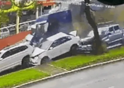 Imagens de câmeras de segurança mostram a carreta, carregada com madeira laminada, seguindo no mesmo sentido dos demais veículos antes de atingi-los em sequência pela traseira.