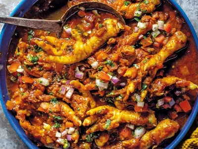 Na África do Sul, o pé de galinha integra pratos populares da culinária local, como o walkie-talkie, preparado com pés e cabeça do frango, geralmente cozido e servido com acompanhamento à base de milho.