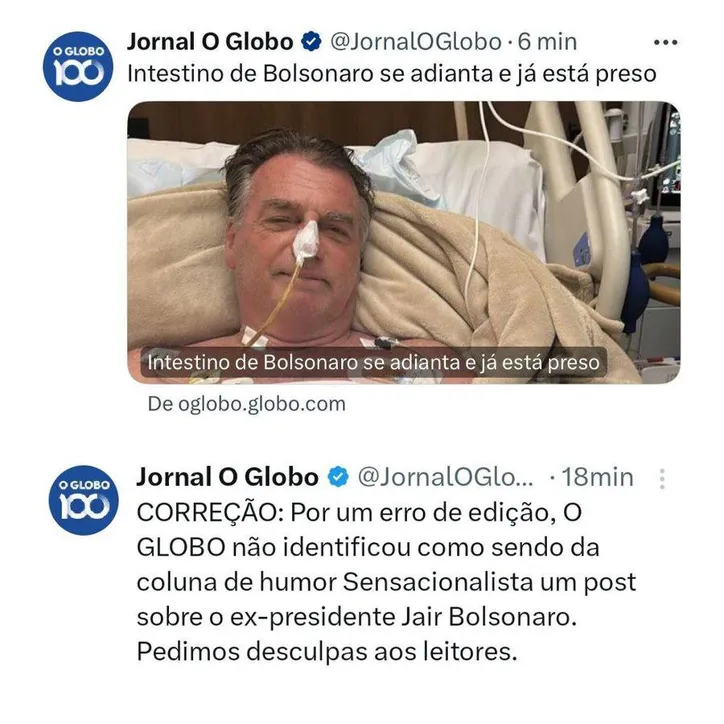 O jornal O Globo, do Grupo Globo, veio a público se desculpar por uma piada veiculada na segunda-feira, 14. Na ocasião, uma postagem do site de humor O Sensacionalista sobre a cirurgia do ex-presidente Jair Bolsonaro (PL) foi publicada como se fosse uma notícia.