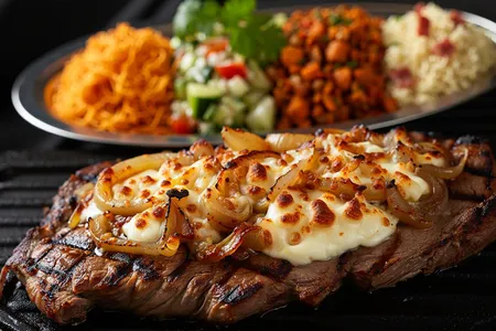 Para experimentar: A fraldinha fugazzeta é coberta com queijo e cebola caramelizada. A carne possui 250g para uma pessoa e o dobro para duas pessoas.