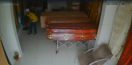 Uma cena inusitada foi registrada em uma funerária localizada na Avenida Caminho de Areia, em Salvador. Um homem foi flagrado pelas câmeras de segurança do estabelecimento furtando um ventilador no salão principal, onde são expostos os caixões.